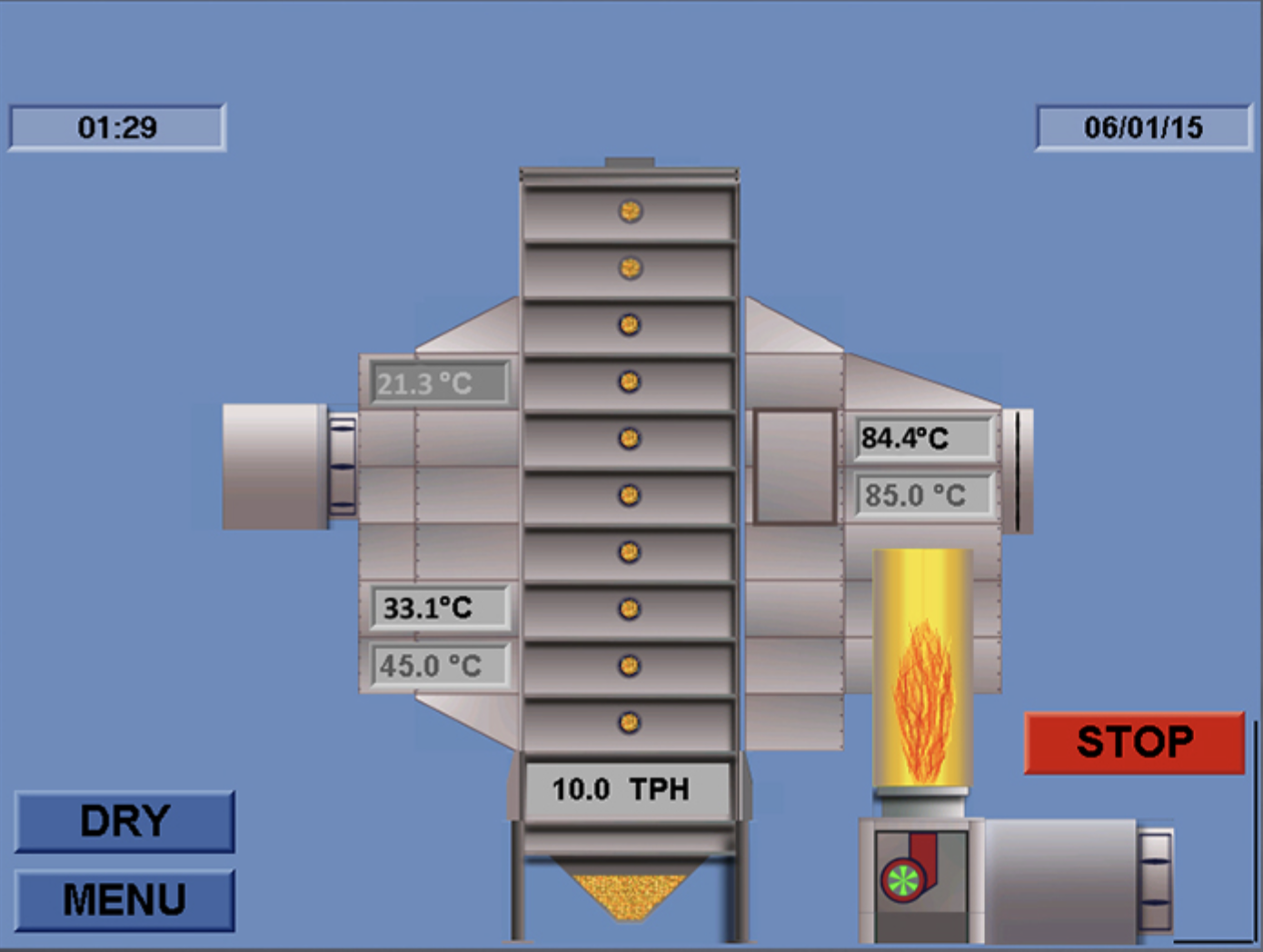 The Perry PLC Dryer Control Panel comes as standard with both the Perry Savannah Series Continuous Mix Flow Dryers & the Perry Belt Drier. The difference between the two panels being the visual representation of the dryer & products available in the crop set-up pages.